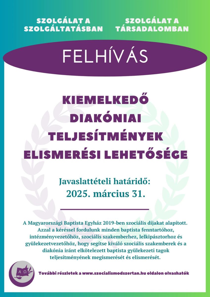 A Magyarországi Baptista Egyház 2019-ben szociális díjakat alapított. Azzal a kéréssel fordulunk minden baptista fenntartóhoz, intézményvezetőhöz, szociális szakemberhez, lelkipásztorhoz és gyülekezetvezetőhöz, hogy lehetőségei szerint segítse kiváló szociális szakemberek és a diakónia iránt elkötelezett baptista gyülekezeti tagok teljesítményének megismerését és elismerését. Ez a közreműködés támogatja a díjakról döntő kuratóriumi testületeket, hogy látókörükbe kerülhessenek díjazásra érdemes szakemberek. Javaslattételi határidő: 2025. március 31.