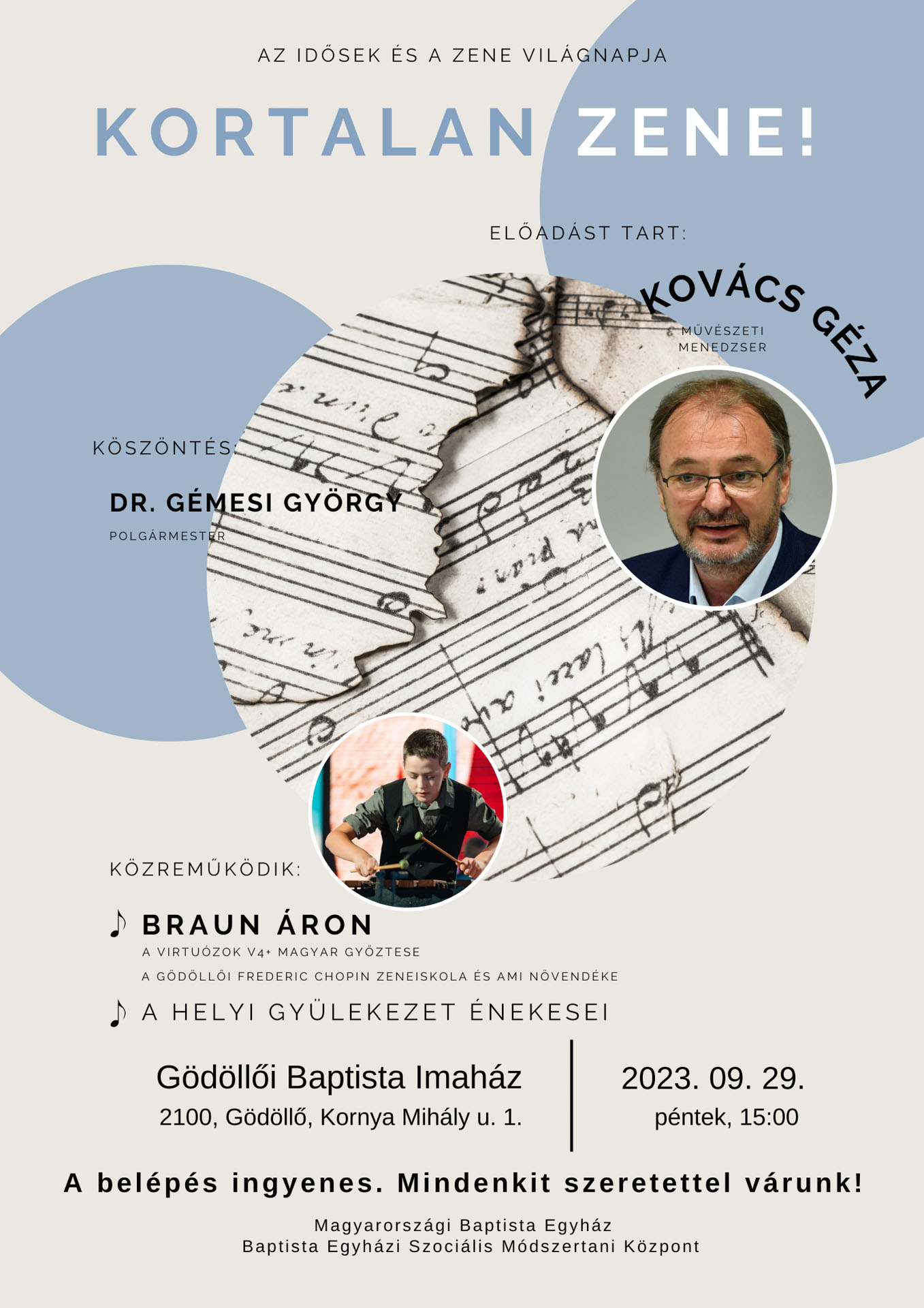A Baptista Egyházi Szociális Módszertani Központ már több mint tíz éve egy-egy előadással egybekötött zenei programmal köszönti az október 1-jén esedékes idősek és a zene világnapját. Ebben az évben Gödöllőn a baptista imaházban fogjuk megtartani ezt az ingyenes rendezvényünket szeptember 29-én 15 órától a helyi és környékbeli lakosok, az idősek és a kortalanok, valamint a baptista és más felekezethez tartozók részére.