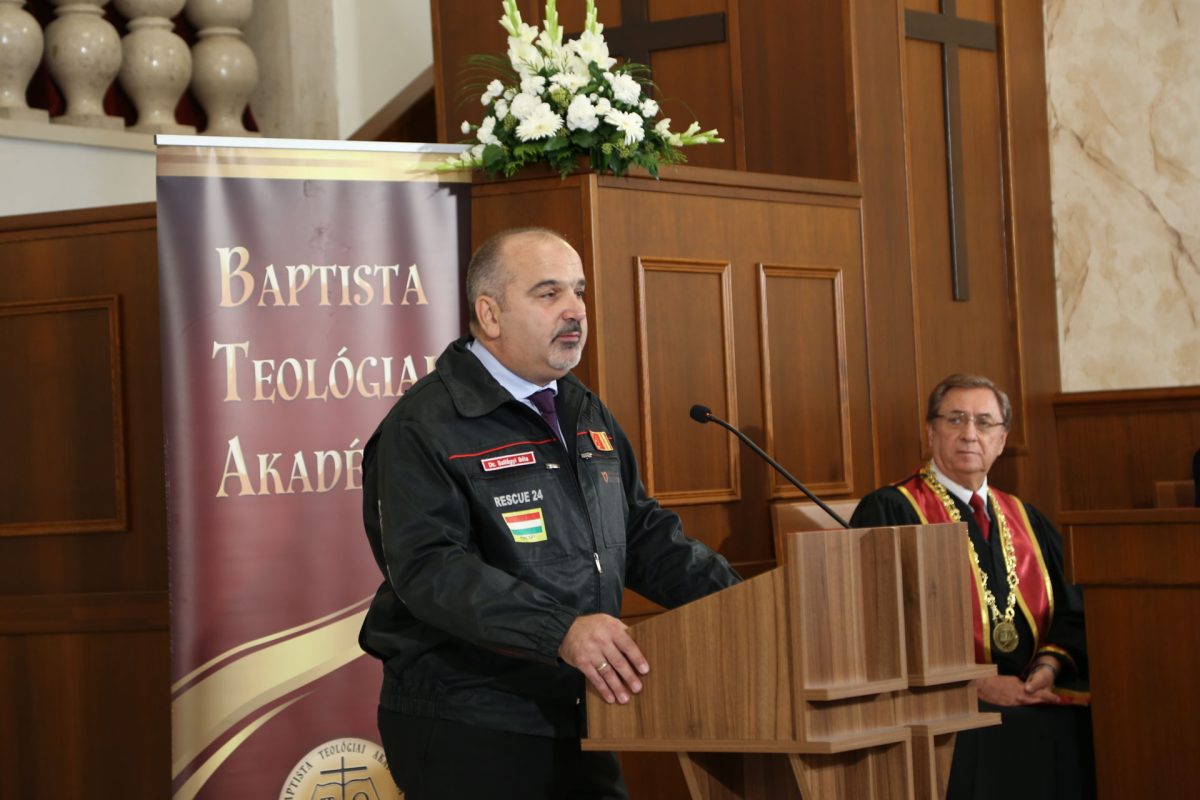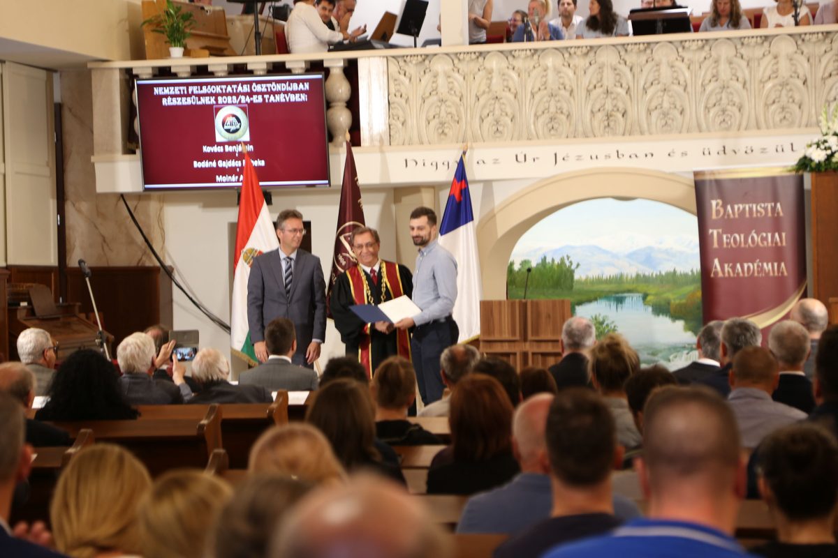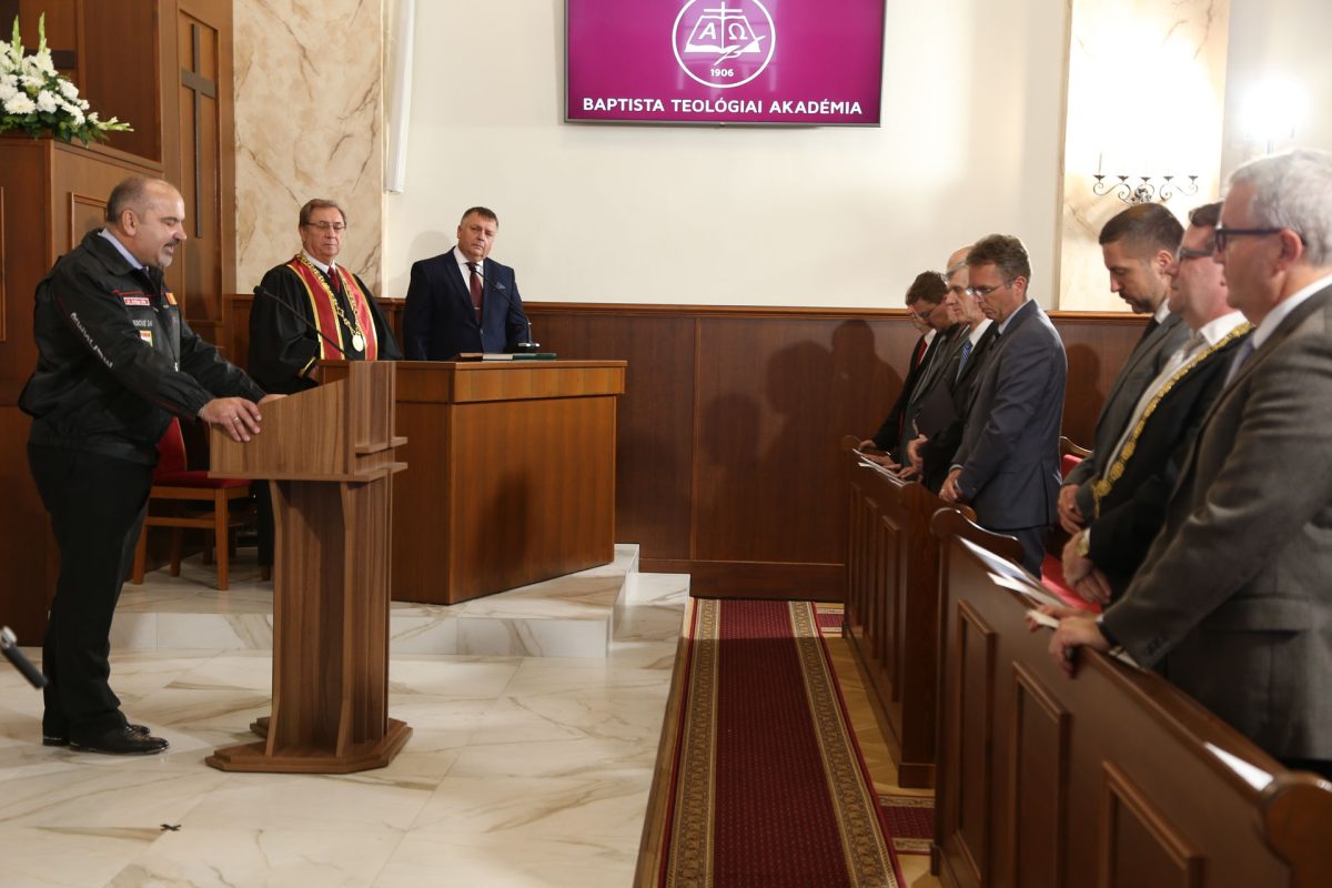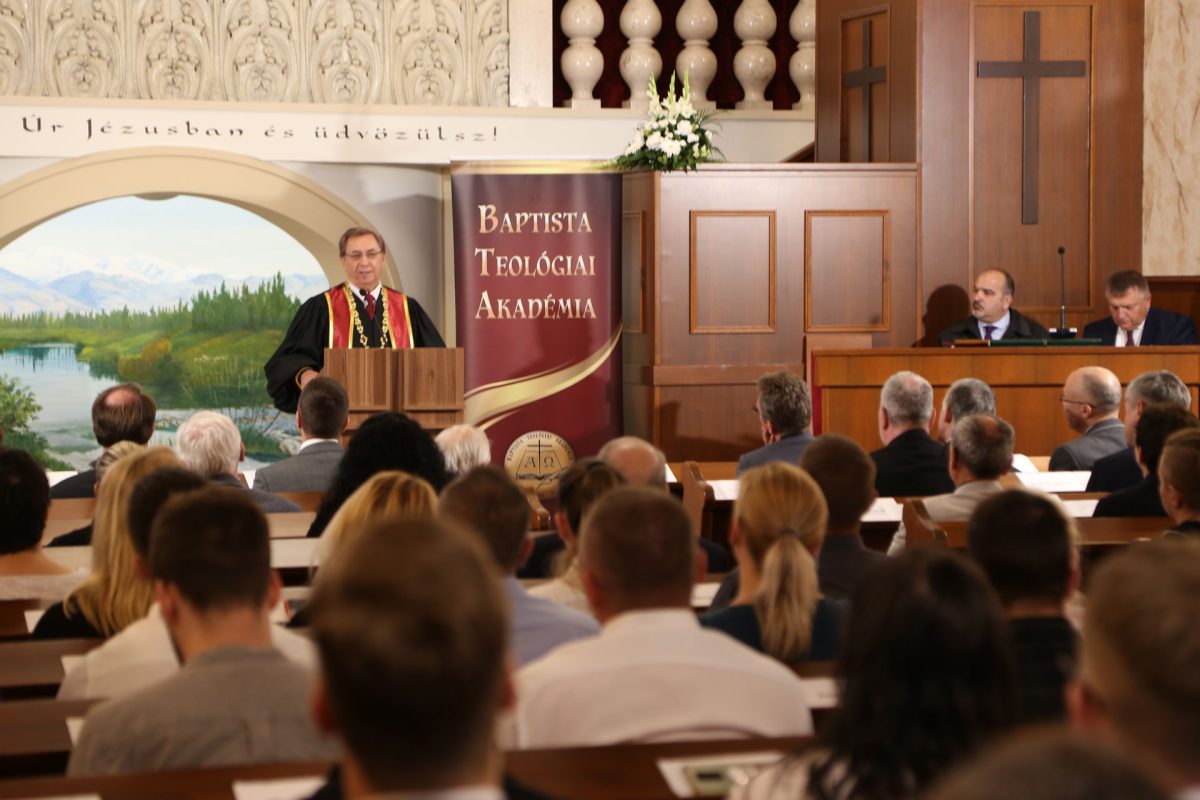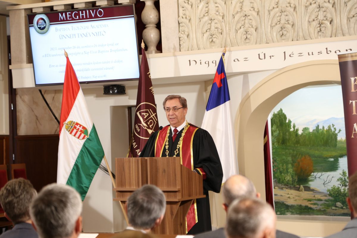 Hankó Balázs államtitkár köszöntő szavaiban arról beszélt, milyen isteni kegyelem az, hogy mi itt lehetünk Európa szívében, és ezzel küldetést is kaptunk. Az a küldetésünk, hogy formáljuk nemzetünk, családunk által a világ jövőjét, amihez kitartás, hit, erő kell. A Biblia szavaival élve: „De akik az Úrban bíznak, erejük megújul, szárnyra kelnek, mint a sasok, futnak, és nem lankadnak meg, járnak, és nem fáradnak el.” A jövő formálásához tudáselőnyre van szükségünk, és emellett közösségre. Egy olyan közösségre, amely értékálló, értékformáló, ezért is olyan fontosak az egyházi fenntartású intézmények. A digitalizálódó világban, a mesterséges intelligencia kihívásait látva még inkább szükség van mindarra, ami emberi, ami közösséget teremt és közösséget formál. Ebben a folyamatban a hallgató cselekvőképes alkotó. A tanár nemcsak tanár, hanem tudását, bölcsességét átadó mentor. Természetesen fontos a tudományos teljesítmény, de még fontosabb az, hogy az egyházi fenntartású egyetemek azt a kovászt, azt a sót vigyék a mindennapokba, amely a közösséget közösséggé teszi, és amely azt az értékállóságot biztosítja, amely megtartott bennünket itt, Európa közepén, Európa szívében. A 118. tanévét kezdő Baptista Teológiai Akadémia küldetése a kezdetekhez képest még erőteljesebben tágul ki, hiszen nemcsak hitéleti, hittudományi képzések, hanem a baptista közösség által fenntartott, a baptista közösség által működtetett intézményrendszerbe olyan jövőt formálni képes fiatalok és régebb óta fiatalok szükségesek, akik képzését az akadémia vállalja fel nemcsak itt Magyarországon, hanem a Kárpát-medencében.