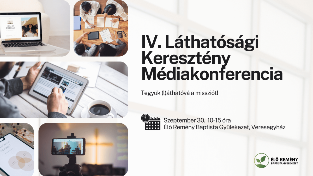 Szeretettel hívunk a IV. Láthatósági Médiakonferenciára, melyet szeptember 30-án az Élő Remény Baptista Gyülekezetben (Veresegyház, Hajnal u. 2.) rendezünk.