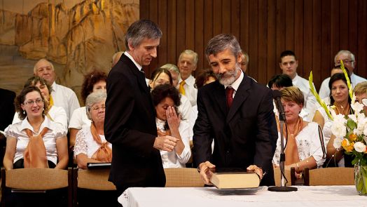 Az énekkar éneke után Mészáros Kornél főtitkár, és mint ügyintéző lelkipásztor néhány gondolatban visszaemlékezett az útkeresésünkre, majd először a gyülekezetnek tett fel kérdést, utána Pető Albert testvérnek, melyre egybehangzó „igen”-nel válaszoltunk. Az ünnepélyes fogadalomtétel és áldáskérő ima után Bereczki Lajos testvér, aki 17 évig volt pásztora gyülekezetünknek, szívhez szóló gondolatok kíséretében átadta a szószéki Bibliát.