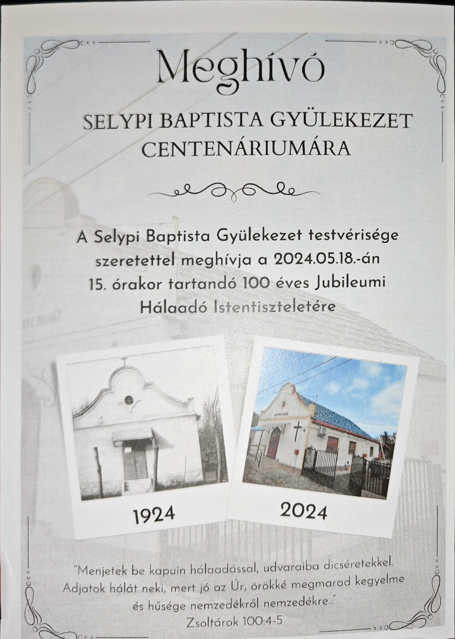 Május 18-án, szombaton 15 órától 100 év gondviselésére emlékezünk a Selypi Baptista Gyülekezetben. Szeretettel hívunk minden elszármazott testvért és mindazokat, akik szívesen ünnepelnek velünk.