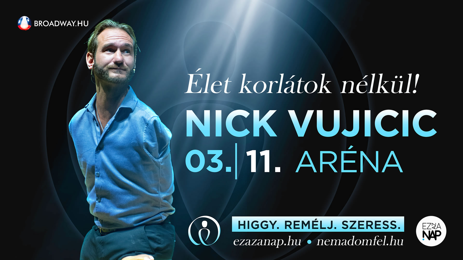 Március 11-én a Budapest Arénában tart előadást Nick Vujicic. A végtagok nélkül született motivációs előadó és prédikátor ezen az estén az evangélium örömüzenetét is hirdetni fogja, ezért bátorítunk benneteket, hogy hívjatok el minél több barátot, ismerőst, családtagot az eseményre. Biztatjuk a gyülekezeteket, hogy mozduljunk meg együtt, hogy minél többen befogadhassák a szívükbe Isten szeretetét.