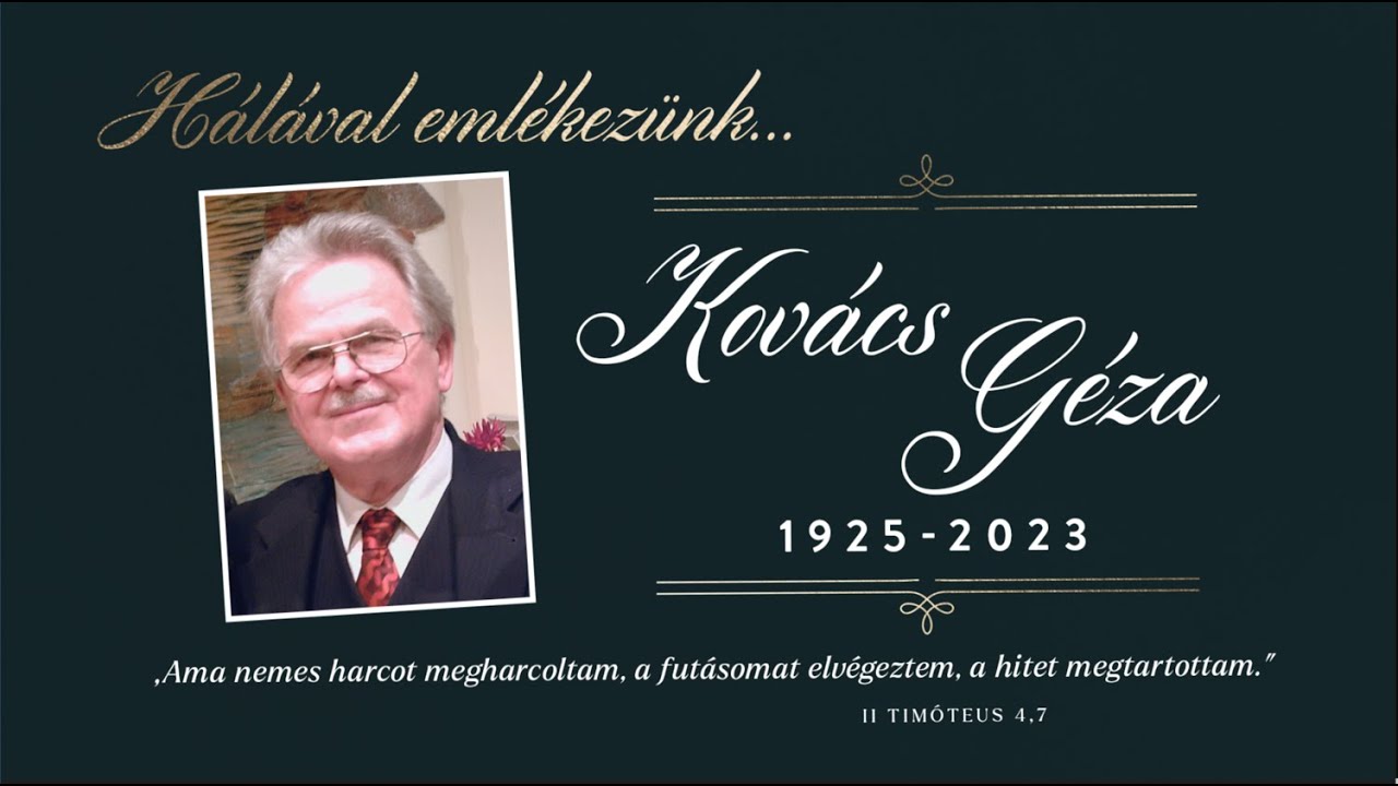 2023. január 23-án id. Kovács Géza – mindannyiunk Géza bácsija – 98. életévében megérkezett oda, ahova oly régóta vágyott! Február 4-én hálaadó istentisztelet keretében emlékeztünk meg róla a Budafoki Baptista Gyülekezet imaházában.