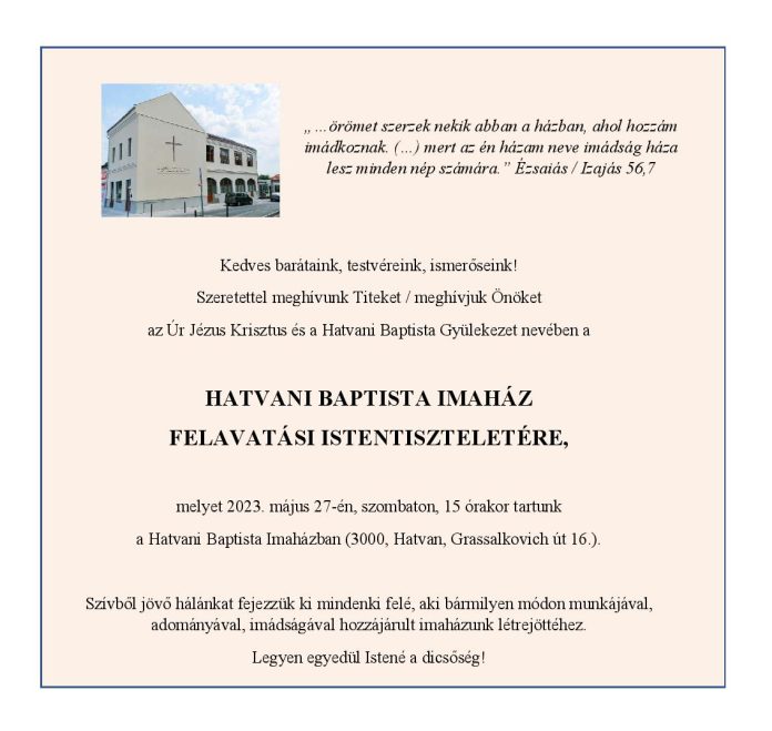 Szeretettel meghívunk Titeket / meghívjuk Önöket az Úr Jézus Krisztus és a Hatvani Baptista Gyülekezet nevében a Hatvani Baptista Imaház felavatási istentiszteletére, melyet május 27-én, szombaton 15 órakor tartunk a Hatvani Baptista Imaházban (3000 Hatvan, Grassalkovich út 16.). Szívből jövő hálánkat fejezzük ki mindenki felé, aki bármilyen módon, a munkájával, adományával, imádságával hozzájárult imaházunk létrejöttéhez. Legyen egyedül Istené a dicsőség!