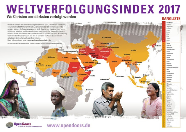 Az üldözés világindexe 2017 ötven országban vizsgálta behatóan a keresztények helyzetét, miközben teljes világkörképet igyekszik adni. Azért 50 ország szerepel elsősorban az elemzésekben, mert ezekben mintegy 650 millió keresztény él állandó vagy vissza-visszatérő üldözöttségi veszélyben. Évek óta hasonló módszerrel vizsgálja és publikálja az üldözöttség világhelyzetét az Open Doors. Céljuk az, hogy évenkénti elemzéseikkel felhívják az egyházak, a média, a politika és a társadalmak figyelmét világszerte a legüldözöttebb közösségre, a keresztényekére.