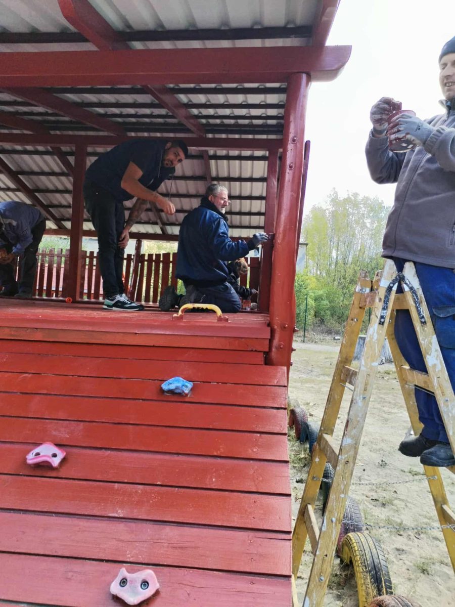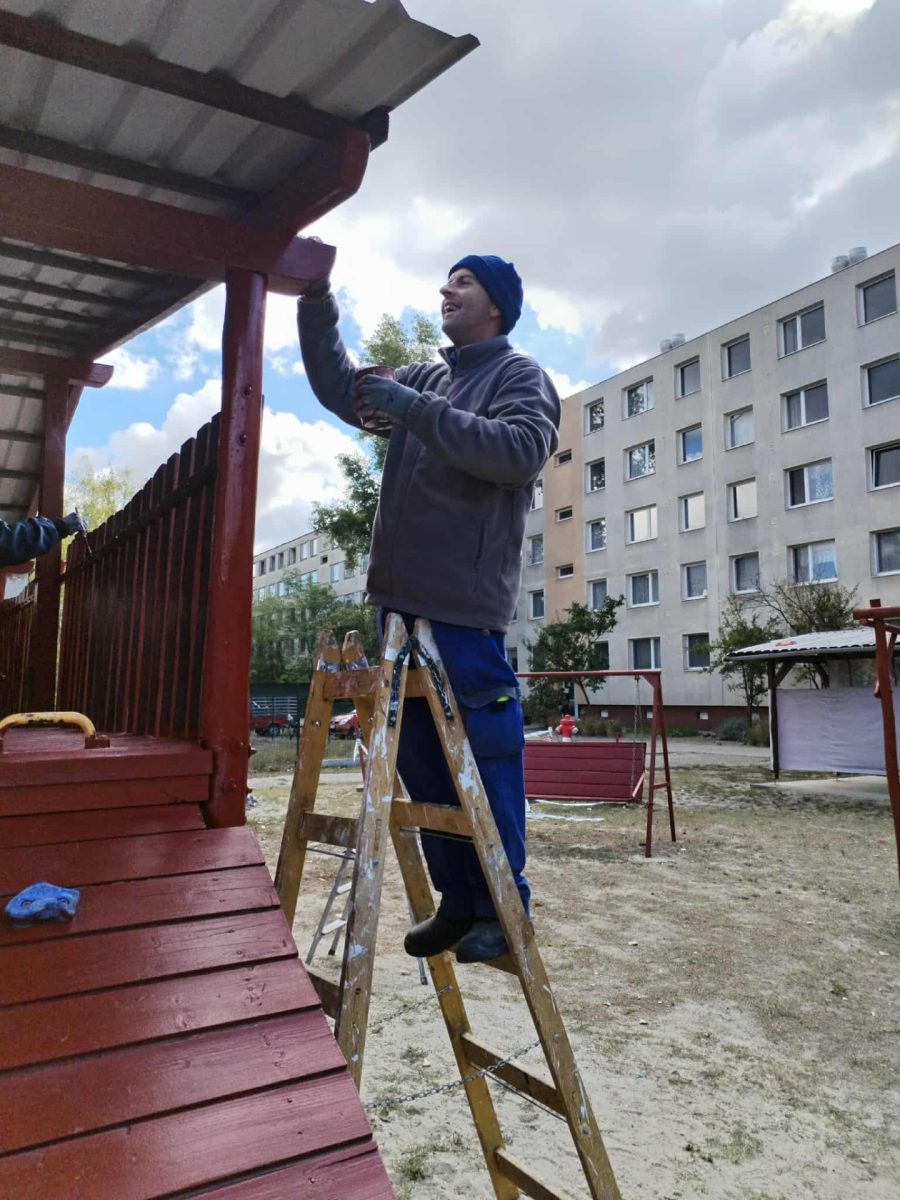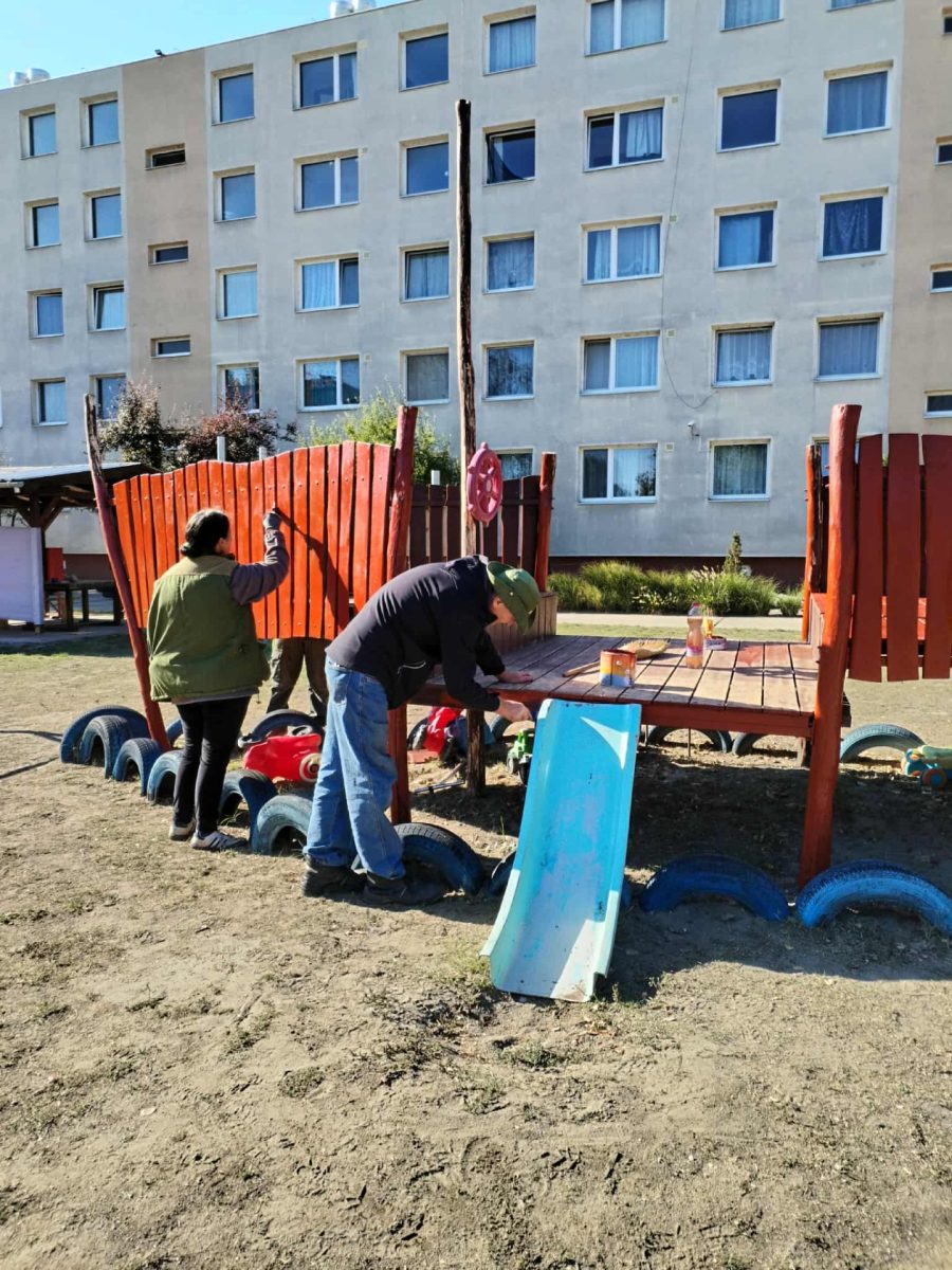 A közfoglalkoztatotti program keretében az ősz folyamán fontos feladatunknak tartottuk a Menedékváros játszóterének karbantartását és lefestését.