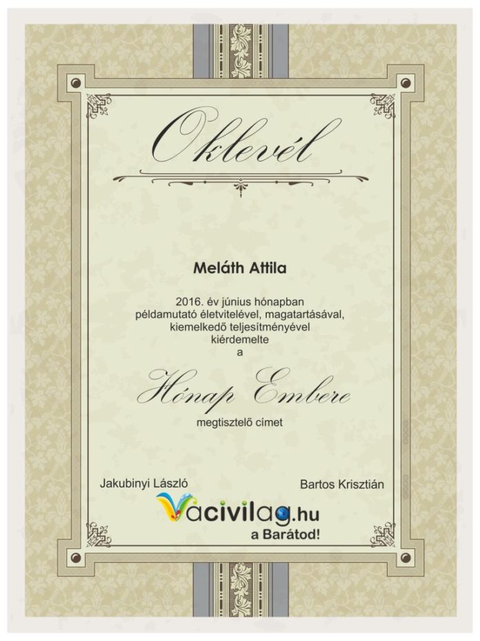 Meláth Attila a www.vacivilag.hu olvasói és szerkesztőségünk tagjainak választása alapján 2016. június hónapban kiérdemelte a hónap embere megtisztelő címet.