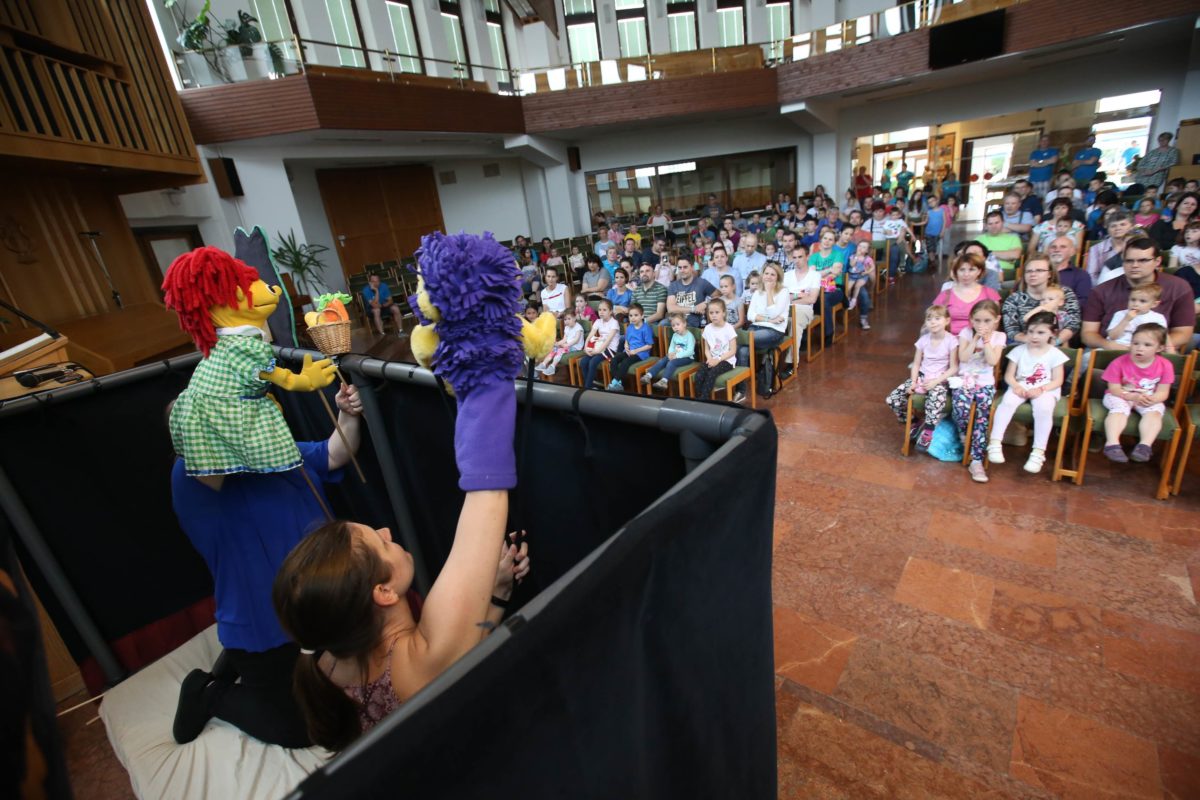Délben kicsit pihenhettek a kicsik és nagyok: közös éneklésre volt lehetőség, és egy bábelőadást nézhettek meg közösen, amit az Apostoli Egyház pécsi gyülekezetéből érkezett bábcsoport mutatott be.