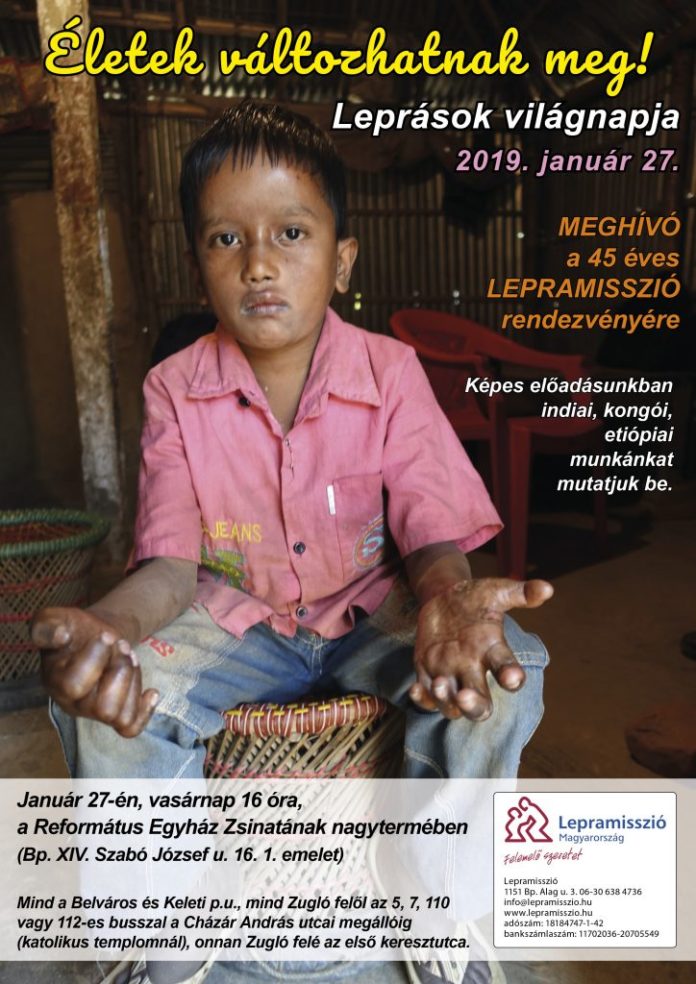 Január utolsó vasárnapja a lepra elleni harc világnapja. Imádkozzunk gyülekezeteinkben január 27-én a leprában szenvedő betegekért, orvosaikért és a lepramisszióért! (A szerk.)