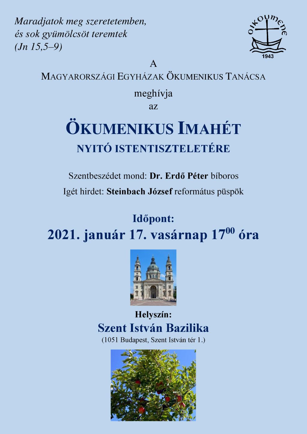 A nyitó istentiszteletet 2021. január 17-én, vasárnap 17 órától tartjuk a Szent István Bazilikában. Sok szeretettel várunk mindenkit!