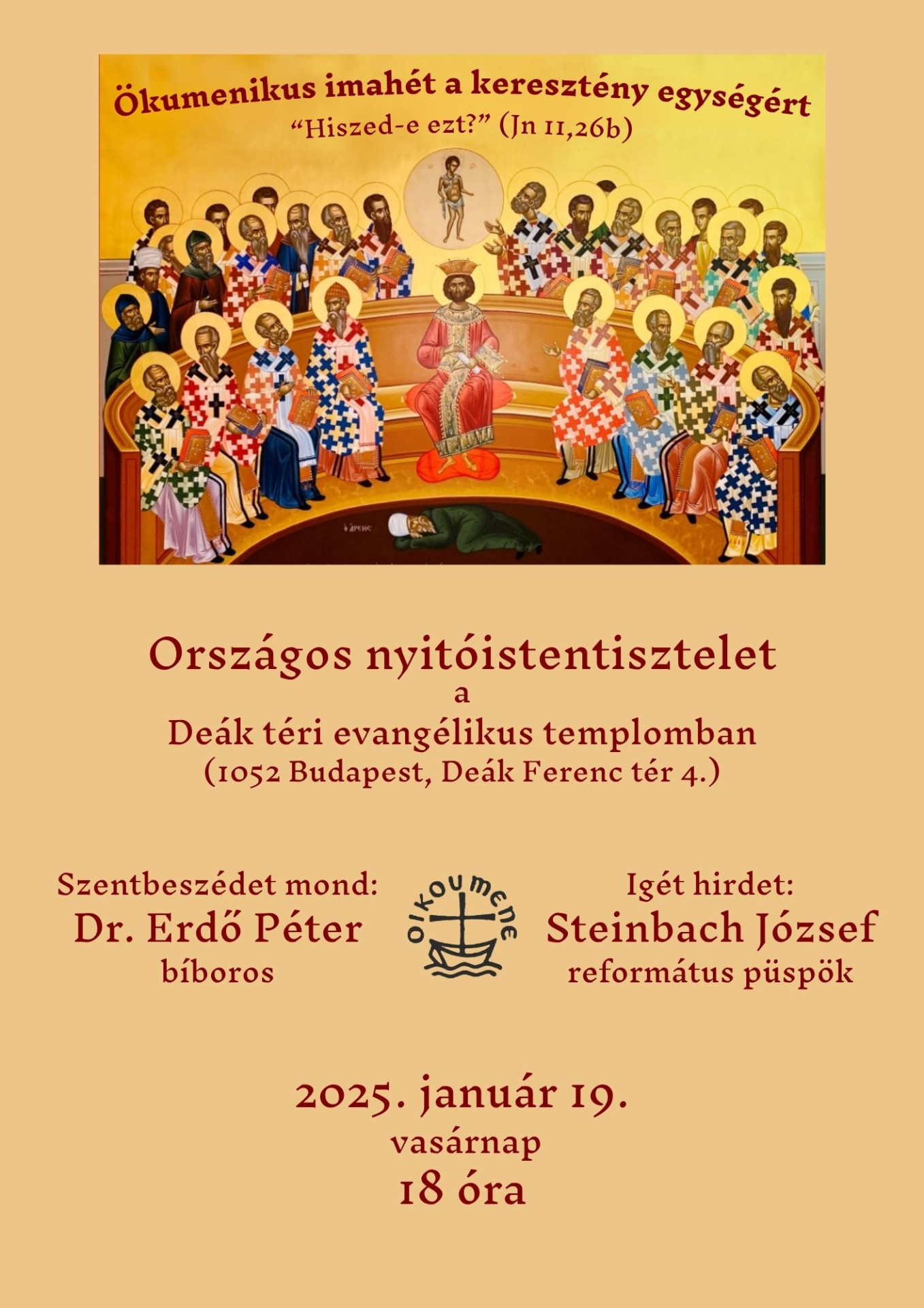 Az országos nyitó istentisztelet 2025. január 19-én, vasárnap 18 órakor lesz a Deák téri evangélikus templomban. Igét hirdet dr. Erdő Péter bíboros és Steinbach József református püspök, a MEÖT elnöke. A liturgiában szolgálnak a MEÖT tagegyházainak vezetői.