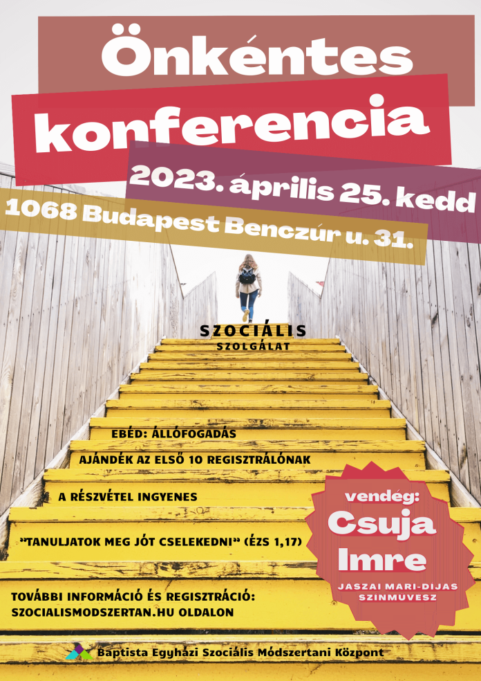 A Baptista Egyházi Szociális Módszertani Központ állófogadással egybekötött önkénteskonferenciára hívja 2023. április 25-re az önkéntesek foglalkoztatása iránt érdeklődőket a szociális szolgáltatásokban, az oktatási, az egészségügyi és egyéb területeken.