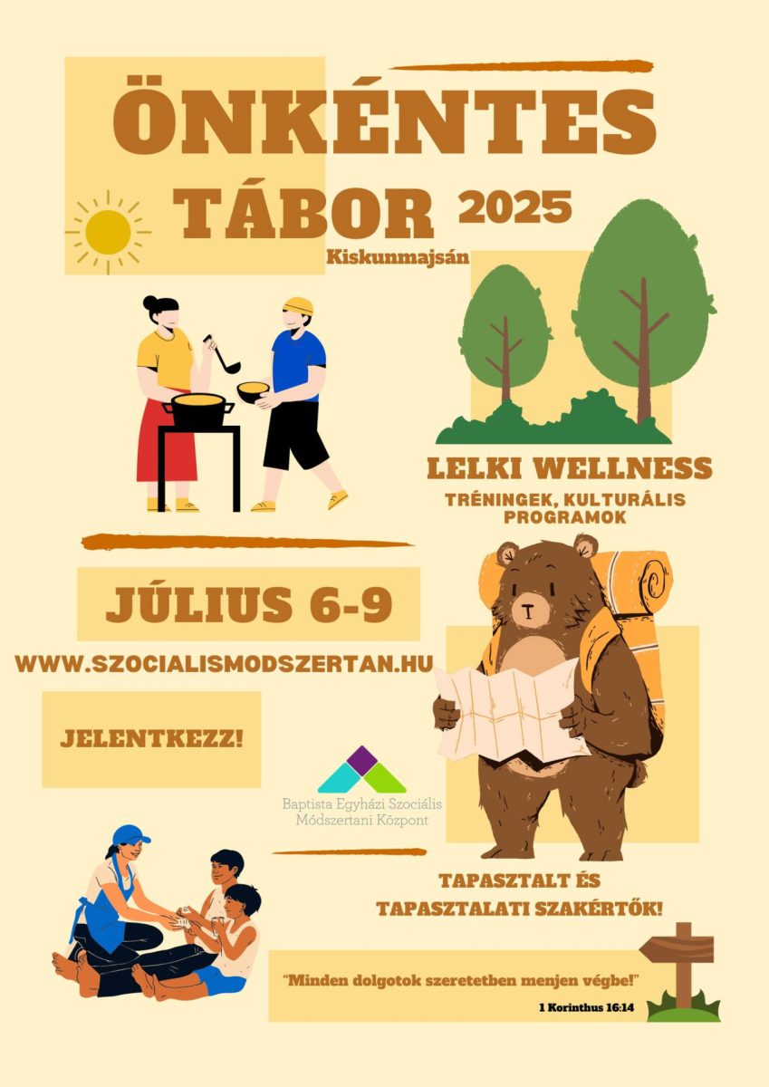 A Baptista Egyházi Szociális Módszertani Központ önkéntes nyári tábort hirdet 2025. július 6–9-ig Kiskunmajsára. Szállás a kiskunmajsai kemping területén lesz.