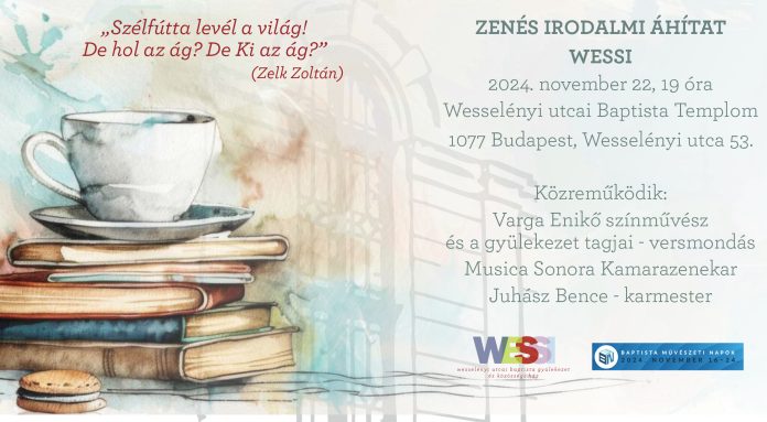 Az Istenhez való kapcsolódás különleges, művészeteken keresztül létrejövő alkalmára került sor a Wesselényi Utcai Baptista Imaházban november 22-én, pénteken este 19 órakor. A kezdeményezés Kovács Arthur testvértől indult el, az alkalom főszervezője Szabó Kornél András volt. Az est folyamán olyan versek, irodalmi alkotások hangoztak el az imaházban, amelyek az Úr és az ember kapcsolatáról beszélnek – őszintén, a bensőséges kapcsolatot, de a küzdelmeket, kételyeket is megjelenítve – a gyülekezet tagjai és Varga Enikő színművész tolmácsolásában. A Musica Sonora kamarazenekar közreműködésével, Juhász Bence vezényletével pedig a zenén keresztül is eljuthattak a jelenlévők a Mindenhatóhoz. És hogy mit jelent a hívő ember életében a művészet, az irodalom, a zene, arról Háló Gyula testvér osztotta meg gondolatait.A különleges, művészeti elemekkel átszőtt áhítat a Baptista Művészeti Napok programsorozatának keretében került megrendezésre.