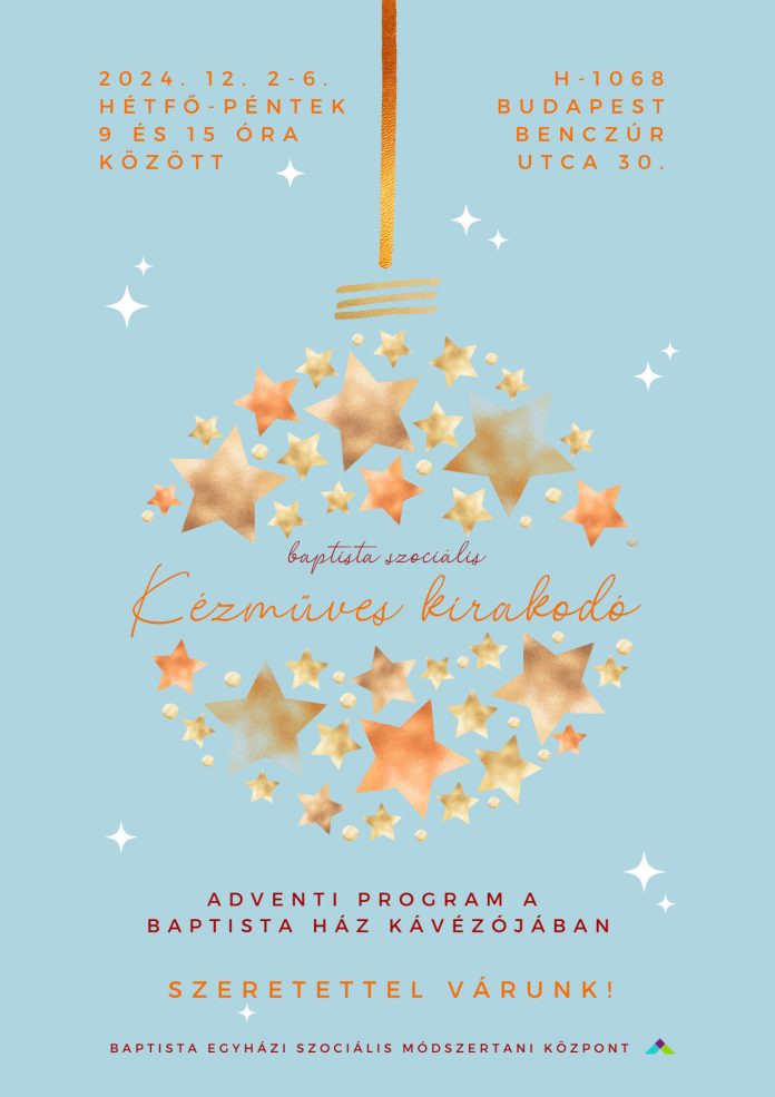 A Baptista Egyházi Szociális Módszertani Központ második alkalommal rendezi meg kézműves kirakodóját december 2 és 6 között, napközben (9-15 óráig), a Baptista Házban (1068 Budapest, Benczúr u. 30), vállalkozókedvű baptista fenntartású szociális intézmények, önkéntesek részvételével. Sok helyen rendszeresen készülnek szebbnél-szebb kézműves alkotások. Ebből kínálunk egy válogatást idén is. A vásárhoz hétfőtől csütörtökig délutánonként lelki-kulturális programok is kapcsolódnak (ingyenes de regisztrációhoz kötött), amire szintén szeretetettel várunk minden érdeklődőt , aki arra jár ezekben a napokban!