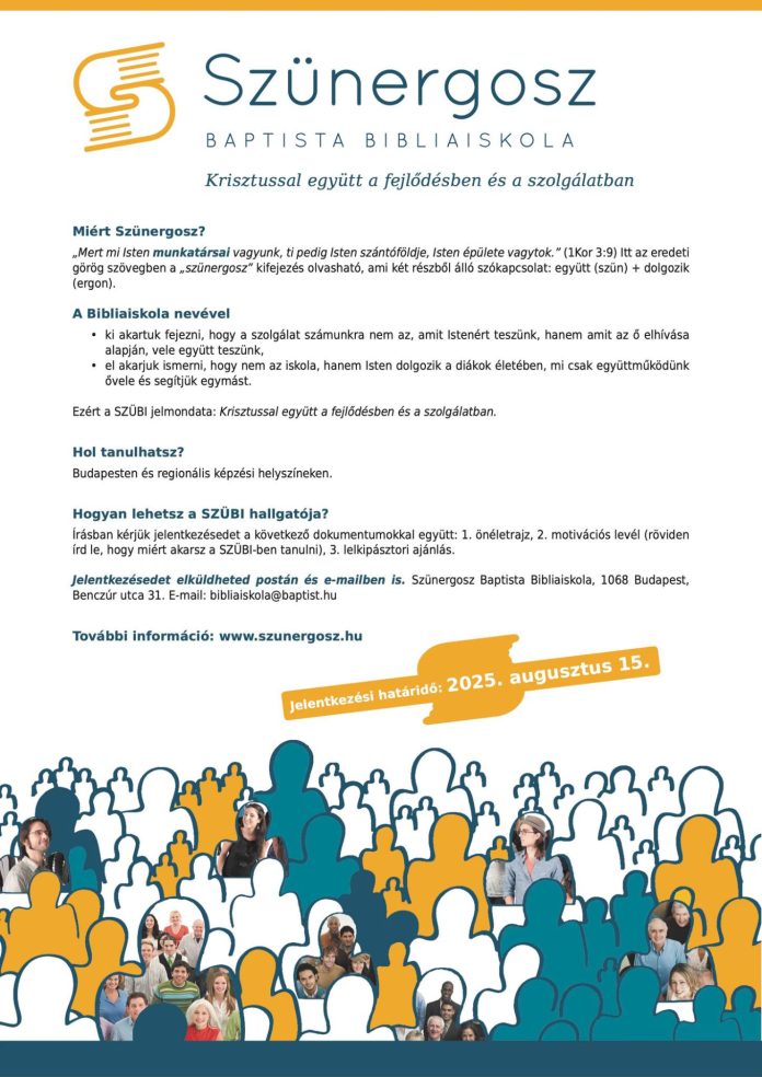 Jelentkezésedet elküldheted postán és e-mailben is: Szünergosz Baptista Bibliaiskola, 1068 Budapest, Benczúr u. 31. bibliaiskola@baptist.hu
