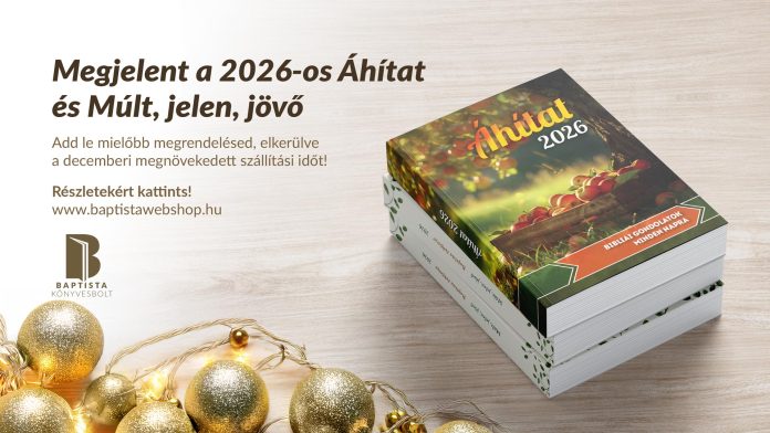 Megjelent a 2026-os Áhítat – bibliai gondolatok az év minden napjára és a 2026-os Múlt, jelen, jövő kalendárium. Az áhítatoskönyvben minden napra találunk egy igerészt, egy napi igét, hozzá tartozó gondolatsort és irodalmi illusztrációt. Ára: 3600 Ft. Az évkönyv kincsestárában igehirdetés, tudományos előadások, gyermekmesék, bizonyságtételek, egyházi és gyülekezeti események rövid, képes beszámolói olvashatók. Ára: 3600 Ft. A két kiadvány egységcsomagban 6800 Ft. Megvásárolható a baptistawebshop.hu oldalon. Add le mielőbb megrendelésed, elkerülve a decemberi megnövekedett szállítási időt!