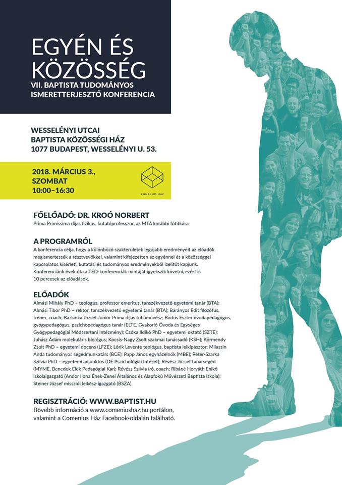 A Magyarországi Baptista Egyház Comenius Ház projektje pályázatot hirdet középiskolai diákok számára előadás megtartására a 2018. március 3-án megrendezésre kerülő VII. baptista tudományos ismeretterjesztő konferencián.