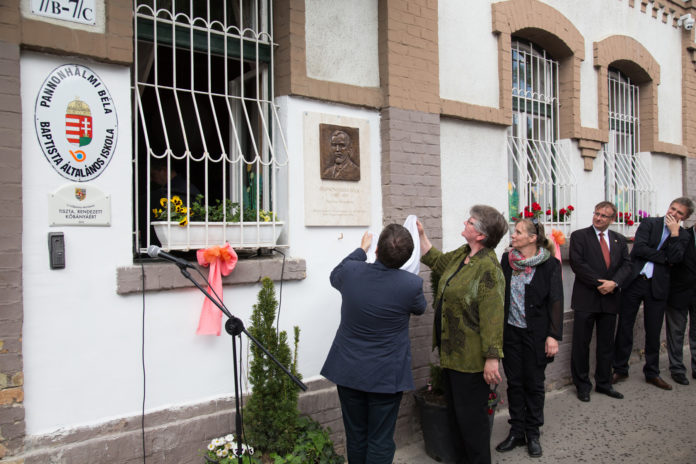 13173950_929383107184103_1850525681298930896_nA magániskolát 2012-ben a Baptista Szeretetszolgálat karolta fel, második otthont teremtve száz meg száz gyermeknek. A fenntartóváltást a nevelőtestület belülről jövő késztetésére külső-belső megújulás követte. Új arculatot adtunk iskolánknak. Ennek első lépéseként fontosnak tartottuk, hogy egy baptista iskolához illő nevet válasszunk ennek az intézménynek. Olyan személyt kerestünk névadónak, akinek élete valamilyen szálon kötődik gyermekeinkhez. A nevelőtestülettől, a szülőktől és a baptista egyház tagjaitól is több javaslatot kaptunk már, amikor bekopogtatott hozzám egy futár. Vaskos bordó könyvet tartott a kezében, melynek címe a következő volt: „Krisztusért járva követségben”. Szabó Csaba, a Baptista Szeretetszolgálat oktatási igazgatója küldte: „Ebben megtalálod, akit keresel!” – szólt a benne lévő üzenet. A még töretlen borítójú könyv hívogatóan arra várt, hogy kezembe vegyem és felüssem. Télesti félhomályban nyitottam ki a könyvet, és az első név, aminek betűi kirajzolódtak előttem, Pannonhalmi Béláé volt. A név alatti sorokban megbújt egy mondat, mely nem eresztett: