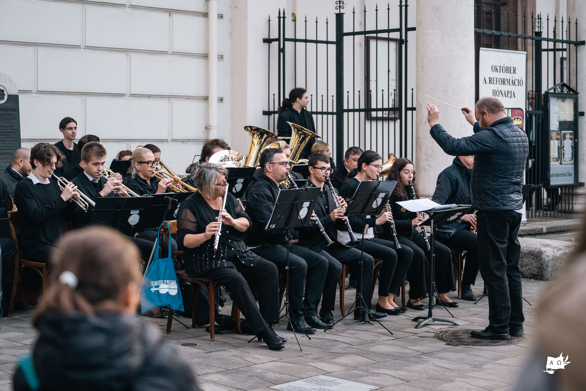 Az istentisztelet előtt fél órával az Egressy Béni Református Művészeti Szakgimnázium Fúvószenekarának játéka csalt mosolyt a templom előtt várakozók és az arra járó turisták arcára.