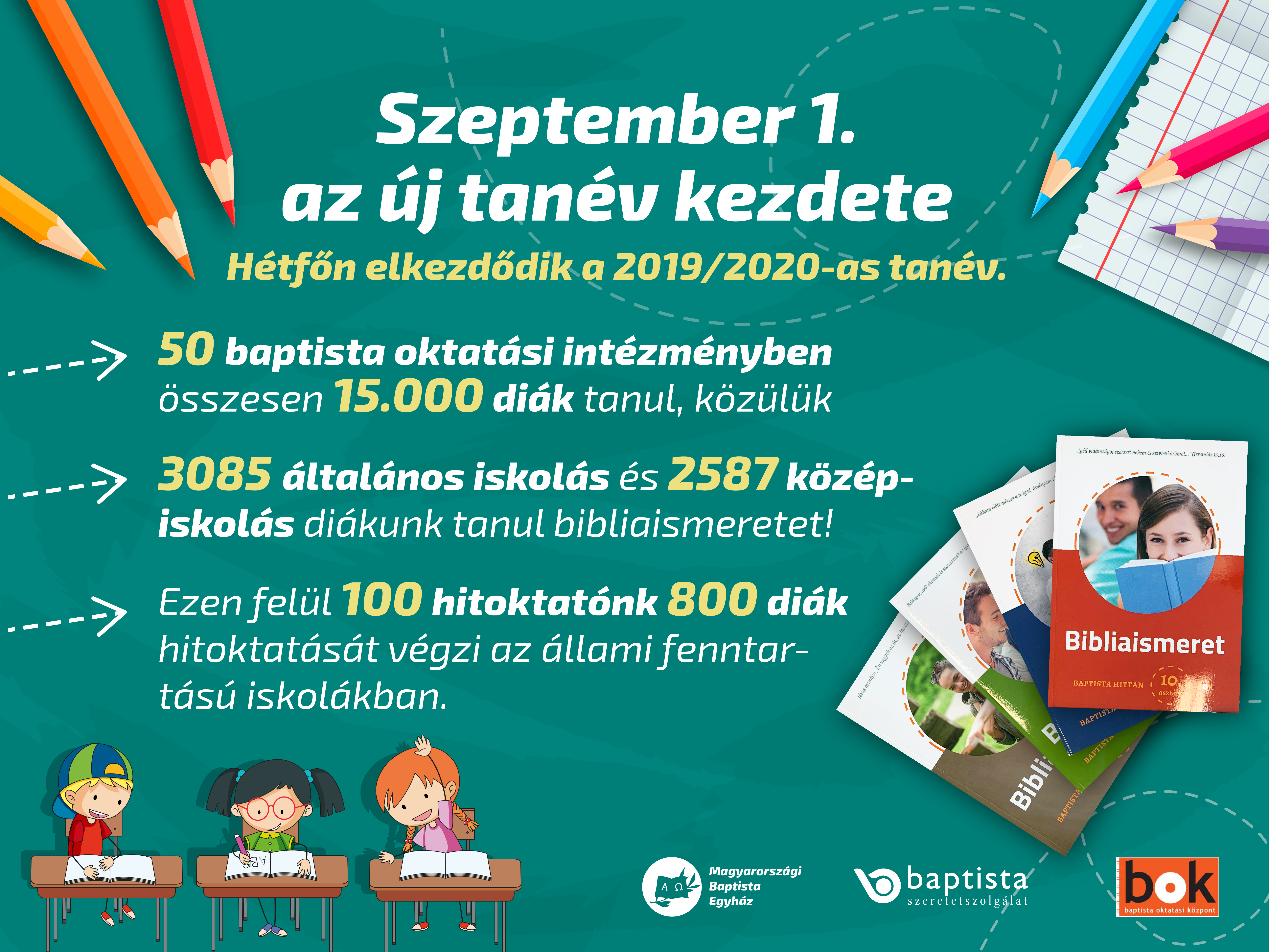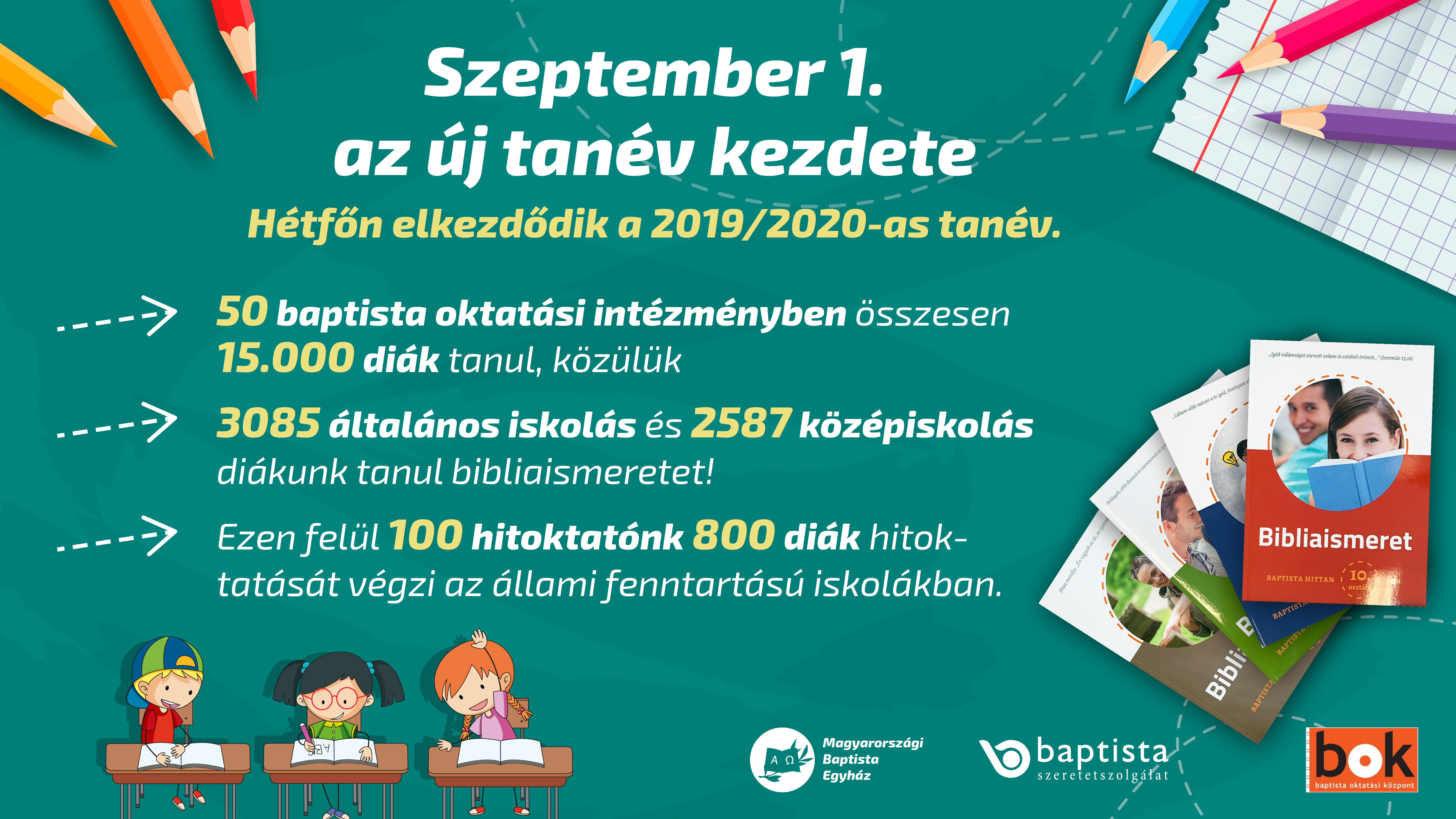 A Magyarországi Baptista Egyház és a Baptista Szeretetszolgálat fenntartásában 50 baptista óvodában, iskolában és középfokú oktatási intézményben kezdődik el az oktató-nevelő munka. Iskoláinkban ebben a tanévben az ide járó 15 000 diák közül 3085 általános iskolás és 2587 középiskolás tanul baptista bibliaismeretet az iskolai hitoktatás keretében.