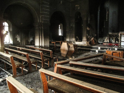 Hamdaniyában még most is folynak kisebb közelharcok. A városba érkezett küldöttség látogatásának különleges pillanata volt a fegyverek dörgésének háttérzajában a Mária-templomban énekelt hálaima az oltár előtt. A templomudvaron könyvégetés nyomai, hamu mindenhol, latin nyelvű Biblia-maradék, arámi vagy éppen arab nyelvű kéziratok hevernek a tízezernyi üres töltényhüvely között.