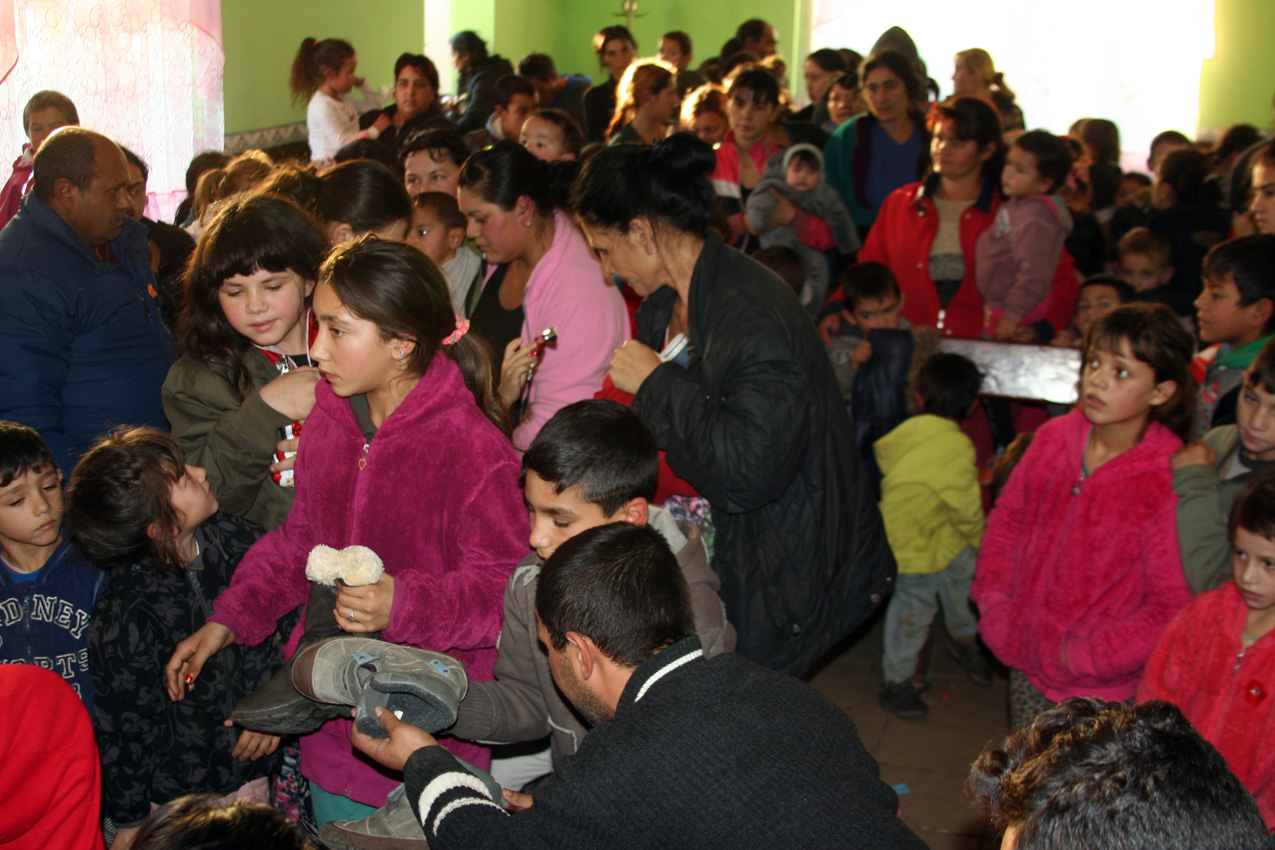 __img_8288Áprilisban voltunk ott először, nagyon sokan jöttek el rengeteg kisgyerekkel. Láttam olyan karon ülő gyermeket, akin alig volt ruha, legfeljebb egy méretben óriási póló cipő nélkül. A csípős idő ellenére sok gyerek papucsban vagy mezítláb érkezett. Ezt a szükséget látva lelkesültünk fel, hogy ha karácsony előtt újra mehetnénk, akkor cipőt, csizmát kellene hoznunk, az lenne a legnagyobb segítség.