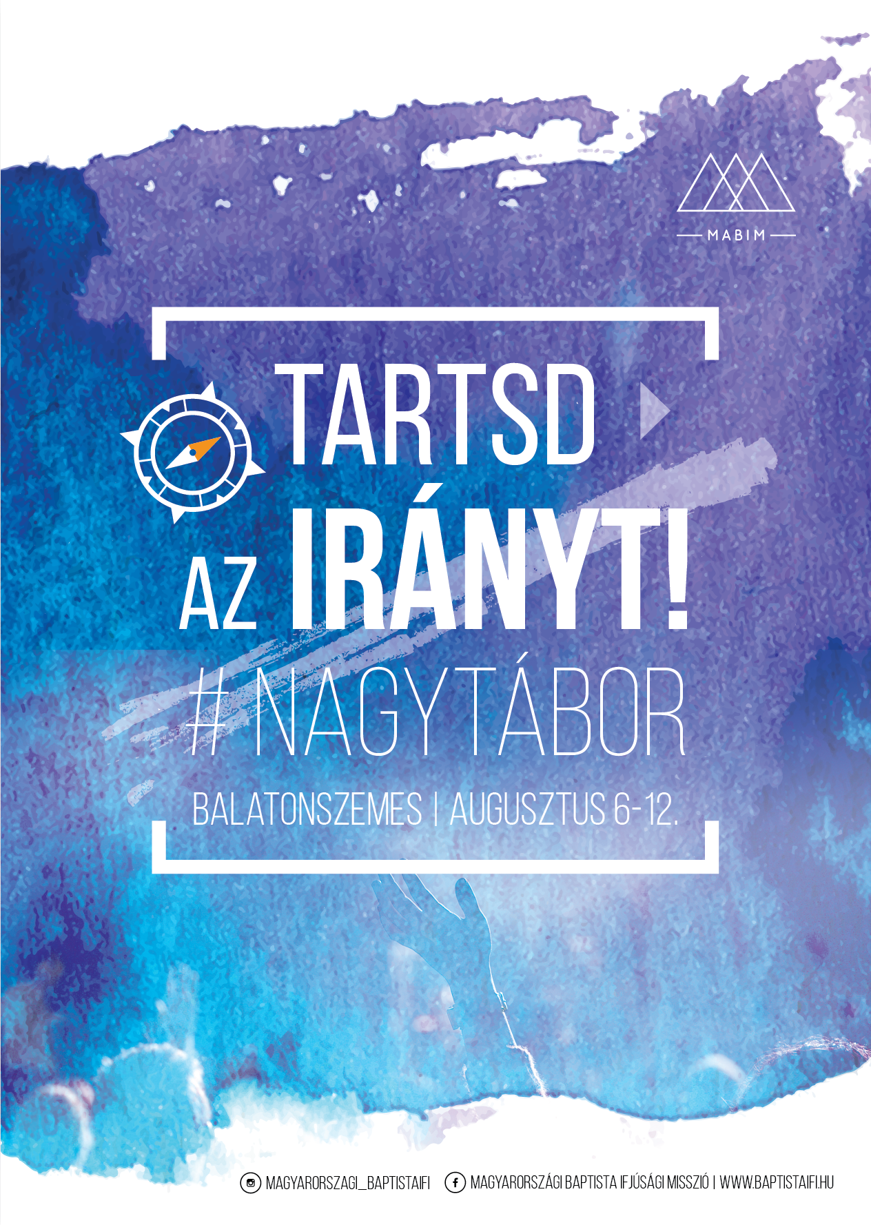 Az idei Baptista Ifjúsági Nagytábort Balatonszemesen rendezzük augusztus 6–12-ig. A MABIM (Magyarországi Baptista Ifjúsági Misszió) szervezésében megvalósuló tábor címe: „Tartsd az irányt!” A hét során azok a témák kerülnek a középpontba, amelyek segítik a fiatalok útkeresését és a helyes irány megtartását. A tábor során célunk, hogy Istenhez hívjuk a résztvevőket, és segítsük őket a krisztusi identitás megszilárdításában és a biblikus életvezetés kialakításában.