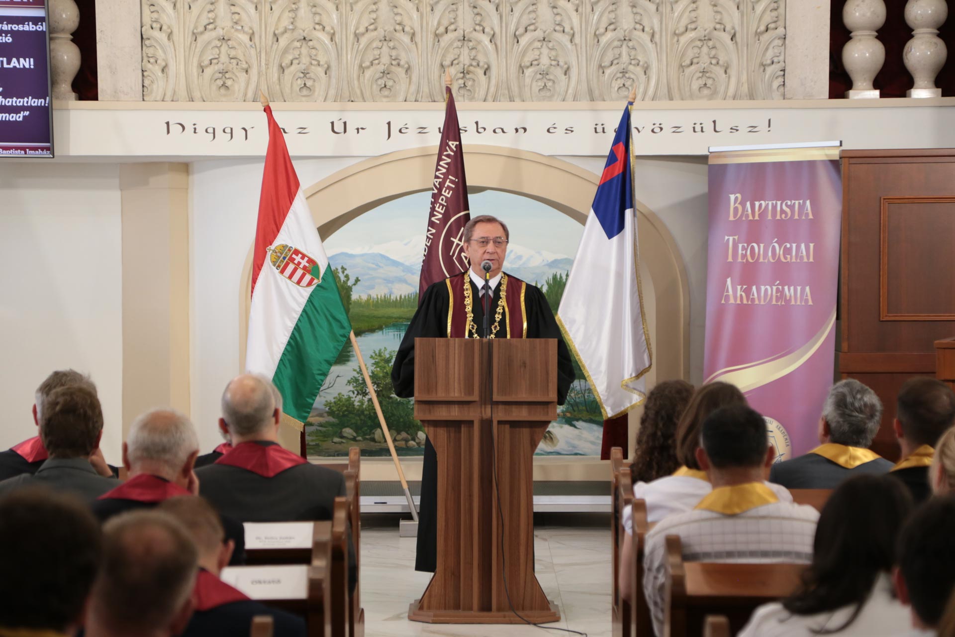 Prof. dr. Mészáros Kálmán rektor nyitóimádsága után a megjelenteket László Gábor főtitkár köszöntötte, aki egyben az esemény levezető elnöke is volt. A végzős hallgatókat arra emlékeztette, mennyi imádság hangzott el a tanulmányi idő alatt, és az Úr meghallgatta azokat, hiszen itt állhatnak a diploma átvétele előtt.