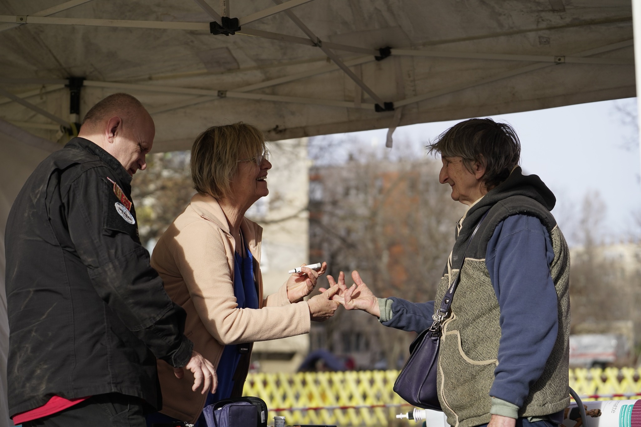 A Halom köznél, a KÖSZI parkolójában egy tál meleg étel mellett használt, de jó minőségű ruhaneműt és tartós élelmiszert kaphattak a hozzánk fordulók, akiknek szakembereinktől lehetőségük volt orvosi, szociális és jogi tanácsokat kérni, tüdőszűrésen részt venni, ajándékot készíteni, a felajánlott könyvek közül olvasnivalót választani. A hajléktalan emberek lelki problémáival igény szerint lelkész és pszichológus foglalkozott. Akinek arra volt szüksége, azt fodrász és pedikűrös fogadta ezen a délutánon 12 és 15 óra között.