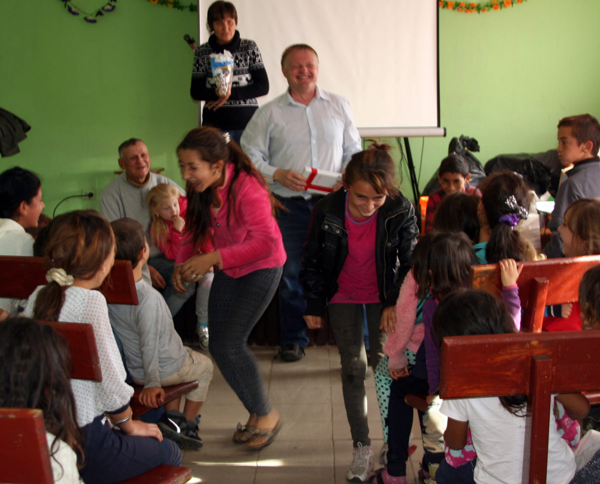 Nagyon hálás volt érte. Kb. 150 gyerek és még felnőttek is részt vettek az alkalmon. A cipő és édességrakomány átadása előtt énekekkel dicsértük az Urat, átadtam az evangélium örömüzenetét és játszottunk sokat. Nem volt egyszerű, mert a sok gyerek viselkedni nem nagyon tudott. Isten igéje élő és ható. Jézus ezt mondta: „Én vagyok az Út az Igazság és az Élet” Senki sem mehet az Atyához, csakis az Ő fián keresztül, aki szörnyű kínhalált halt a mi bűneink kiengesztelésére. Bíztattam a gyerekeket és a részt vevő felnőtteket, hogy, aki még a sötétségben jár, az utálja meg a bűneit, egyszer és mindenkorra fordítson hátat bűnös életének, kérje Isten bocsánatát és hívja be Jézust a szívébe. Jöjjön ki a világosságra. Jézus ezt is mondja: Én vagyok a világ világossága, aki engem akar követni, az sohasem jár sötétségben. Az ajándék osztása is nagyon nehéz volt. Mindenki tolakodott, lökdösődött, minél előbb oda kart érni a cipőkhöz. Nagy kincs ott a cipő.