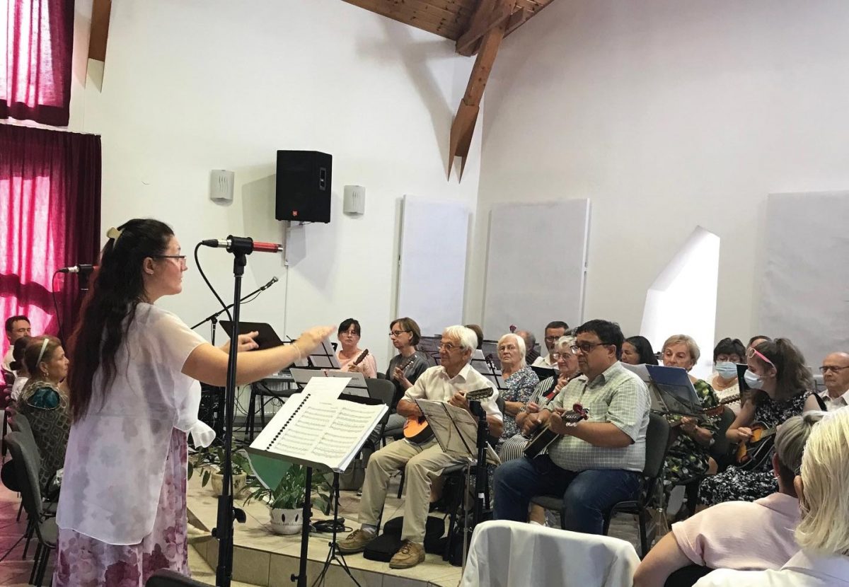 Az összevont pengetőszenekart összehangolta, koordinálta, a zeneszámok közötti összekötő szöveget mondta Aszódról Kovács Ferenc testvér, aki sok szeretettel köszöntötte az egybegyűlteket. „Bibliánkban a 46. zsoltártól kezdve számos helyen olvashatjuk a felszólítást: Dicsérjétek az Urat! Most dicsőítő mandolinzenekar fog szolgálni! Karvezetőink Szabóné Hricsovinyi Renáta és Bíró Zsuzsa lesznek. A zeneszámok között verseket fogunk hallgatni.”